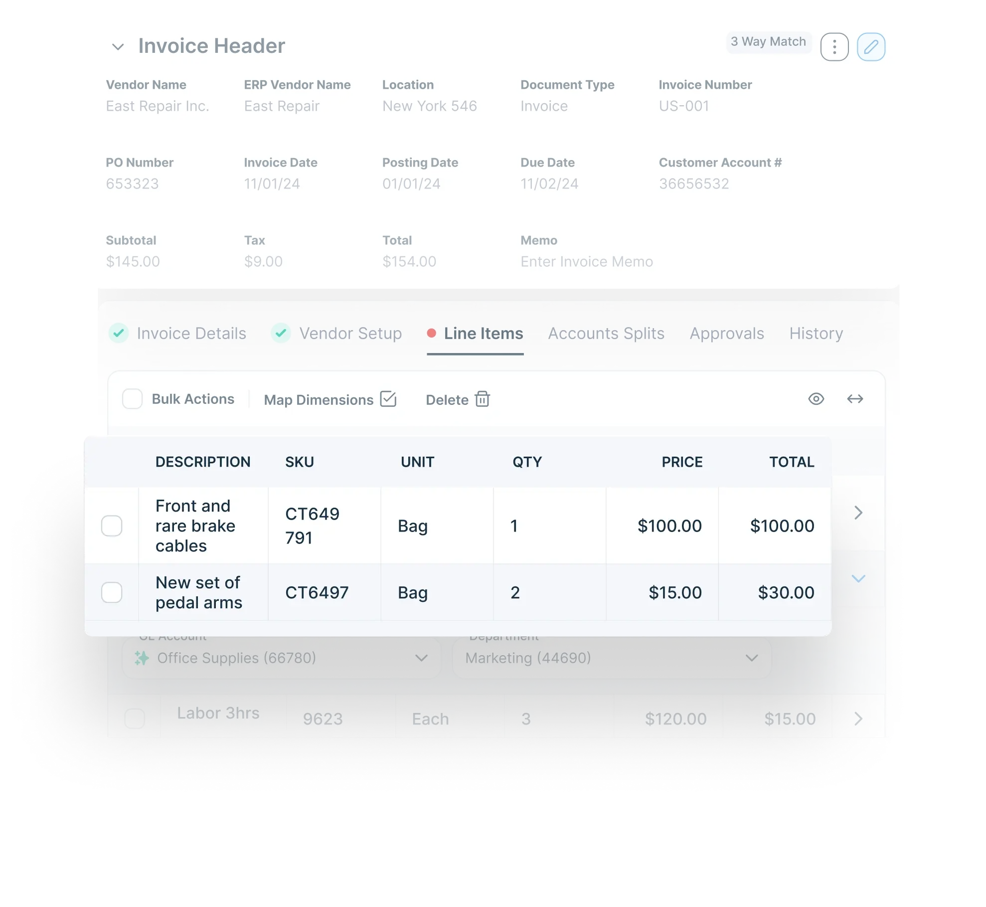 Support NetSuite with advanced AI capabilities to intelligently automate the AP process and adapt to inconsistent invoice formats, unfamiliar abbreviations, and complex line item details.